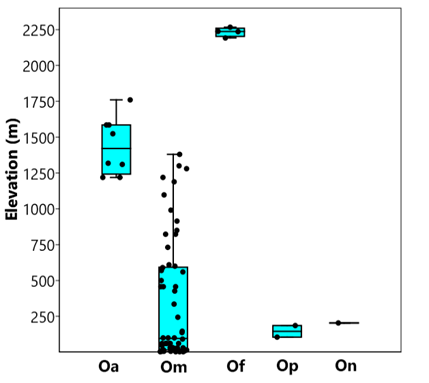 Figure 5 Variation in the elevational distribution of species of Oryzomys in southern and western México. Oa = Oryzomys albiventer, Om = O. mexicanus, Of = O. fulgens, Op = O. peninsulae, On = O. nelsoni. Most altitudinal records were obtained from Carleton and Arroyo-Cabrales (2009).
