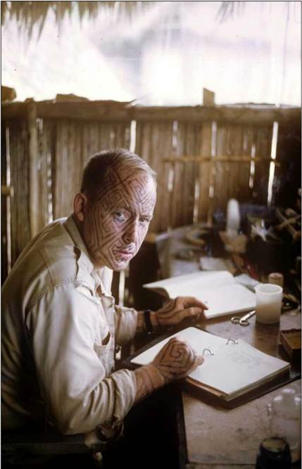 Figure 1 Jim Patton writing field notes in Peru while wearing local, traditional face markings. Photo taken in 1968 just prior to Jim beginning his faculty position at U.C. Berkeley. Photo: Museum of Vertebrate Zoology Archives.