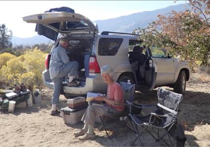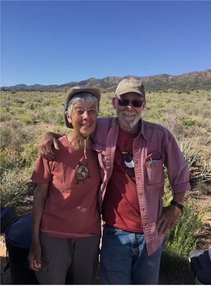 Figure 2 Jim and Carol Patton at Whitney Well, Kelso Valley, California in 2018. Jim is preparing specimens in his field lab while Carol is keying out desert flowers. Photo: Marjorie Matocq.