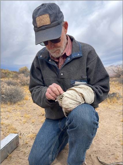 Figure 5 Jim greeting a recently captured woodrat near Shoshone, California in December 2025. This familiarity with organisms and their natural environments is the most fundamental component of evolutionary studies. Photo: Patrick Kelly.