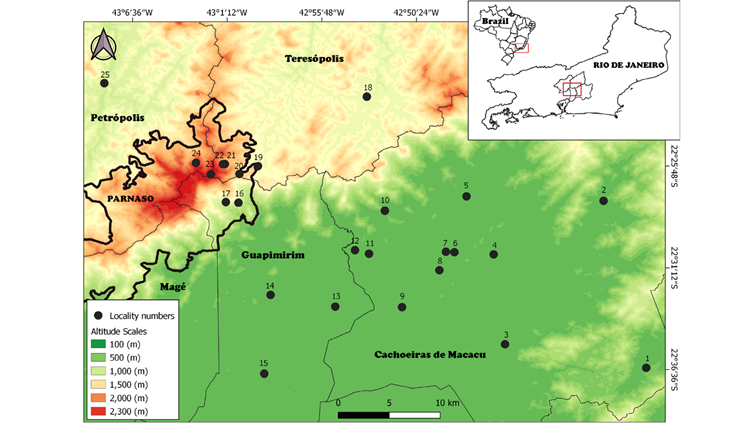 Figure 1 Collection localities for all karyotyped small terrestrial mammals in the Serra do Mar, Rio de Janeiro state. Lines indicate municipality limits. Colors represent the altitudinal scales, from green (lower altitudes) to red (higher altitudes). Red boxes in both Brazil and Rio de Janeiro State delineate the study area. Locality numbers refer to: Cachoeiras de Macacu Municipality: 1. Fazenda Nova Miracema (-22° 36' 33.7" S, -42º 36' 11.6" W, 102 m); 2. Fragmento (-22° 27 ′ 50 ″ S, -42° 39 ′ 10 ″ W, 68 m); 3. Fazenda Santo Estevão e Propriedade do Sr. Edimar (-22° 35’ 44” S, -42° 44’ 20” W, 100 m); 4. Fazenda Pica Pau Amarelo (-22° 31’ 00” S, -42º45’ 16” W, 200 m); 5. Reserva Ecológica de Guapiaçu (-22° 28’ 00” S, -42° 46’ 60” W, 34 m); 6. Conjunto de Fazendas (-22° 31’ 00” S, -42° 47’ 31” W, 100 m); 7. Fazenda Sem Nome (-22° 31’ 00” S, -42º48’ 00” W, 150m); 8. Fazenda Parahy (-22° 32’ 00” S, -42º48’ 19” W, 150 m); 9. São José da Boa Morte (-22° 34’ 4” S, -42° 50’ 20” W, 100 m); 10. Sítio Rosimery (-22° 29’ 00” S, -42º51’ 37” W, 200 m); 11. Estação Ecológica do Paraíso (-22º31’ 19.80” S, -42º52’ 23.20” W, 68 m). Guapimirim Municipality: 12. Fazenda Iguaçu (-22° 31’ 11” S, -42º53’ 12” W, 100 m); 13. Fazendas Consorciadas (-22° 34’ 14” S, -42° 54’ 9” W, 150 m); 14. Fazenda Chorona (-22° 33’ 48” S, -42° 57’ 53” W, 200 m); 15. Centro de Primatologia do Rio de Janeiro (INEA) (-22° 38’ 00” S, -42° 58’ 00” W, 100 m); 16. Parque Nacional da Serra dos Órgãos (PARNASO), Garrafão (-22° 29’ 00” S, -43° 00’ 00” W, 700 m); 17. PARNASO, Subsede, Município de Guapimirim (-22° 29’ 00” S, -43° 00’ 43.48” W, 400 m). Teresópolis Municipality: 18. Fazenda Boa Fé (-22° 23’ 00” S, -42° 53’ 00” W, 880 m); 19. PARNASO, Sede (-22° 27’ 00” S, -42° 59’ 00” W, 1,200 m); 20. PARNASO, Rancho Frio (-22° 27’ 28” S, -43º00’ 2” W, 1,200 m); 21. PARNASO, Trilha do Sino, Parte Baixa (-22° 26’ 59” S, -43° 00’ 54” W, 1,627m); 22. PARNASO, Abrigo 4 (-22° 27’ 00” S, -43º01’ 00” W, 2,130 m); 23. PARNASO, Pedra do Sino (-22° 27’ 34” S, -43° 01’ 40” W, 2,100 m). Petrópolis Municipality: 24. PARNASO, Vale das Antas, Município de (-22° 27’ 00” S, -43° 02’ 33” W, 1950 m); 25. Fazenda Inglesa (-22° 23’ 00” S, -43° 08’ 00” W, 910 m).