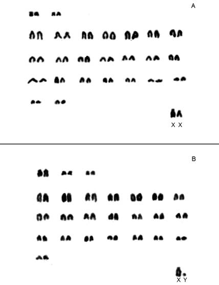 Figure 2 Karyotype of Brucepattersonius nebulosus specimens (A = MN84466) and B = MN84465) obtained using conventional staining. 2n = 52, FNa = 54 and 2n = 52, FNa = 56, respectively.