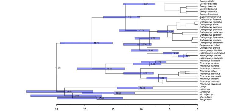 Geomys shows a high inner variation, so its analysis considered two geographical groups in relation to the Mississippi River determined based on the following conditions: 1) presence of different species complexes determined by several authors (Russell 1968a; Williams and Genoway 1980; Hall 1981; Sudman et al. 2006); 2) the marked difference in the nasal shape, being straight in western specimens vs nasals with a strong constriction near the middle in eastern specimens (hourglass-shaped); interorbital area narrow (western) vs a notorious narrow interorbital area (eastern); the east-of-Mississippi population is a different clade from the population thriving in the west side, and is considered basal (Russell 1968a; Penney and Zimmerman 1976; Sudman et al. 2006). The Mississippi River is a mayor barrier for the gopher dispersion, flows from northern Minnesota to the Gulf of Mexico, dividing inland plains by a large stream that is virtually impossible to cross by gophers. We consider the crossing of the river as a hypothesis, which a population was located near the boundary of a meander belt and dispersed into the neck of one lobe of the river that later was cut-off from the mainstream, the population could have crossed the river and diversified. The Mississippi River was established as a geographic barrier that prevented subsequent dispersion events.