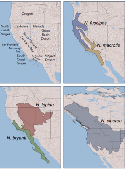 Neotoma fuscipes and N. macrotis. Neotoma fuscipes (Dusky-footed woodrat) and N. macrotis (Big-eared woodrat) are sister lineages that diverged from one another approximately two million years ago (mya; Matocq 2002a). Neotoma macrotis occupies oak and riparian woodlands with well-developed shrub understory (Linsdale and Tevis 1951; Matocq 2002a). Their range extends from Monterey Bay on the central coast of California, south along the Coast Ranges to the Sierra de San Pedro Mártir of northern Baja California, across the South Coast, Peninsular, and Transverse Ranges, north along the western foothills of the Sierra Nevada and along the eastern side of the Sierra Nevada to Bishop, California (Figure 1). Their northeastern range limit occurs near the South Fork of the American River (Matocq and Murphy 2007). One isolated population is known in the Granite Mountains of the Mojave Desert, likely a Pleistocene relict from when the species was more widespread across what is currently the Mojave Desert (Smith et al. 2000).