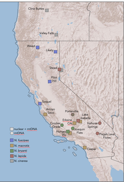 The ranges of N. lepida and N. bryanti are parapatric with two known areas of active hybridization (Patton et al. 2007): one in the Kelso Valley of the western Mojave Desert (Shurtliff et al. 2014; Jahner et al. 2021; Nielsen et al. 2023) and the other in the Morongo Valley of southern California (Klure et al. 2023). Historic hybridization between the two species has led to a pattern of mitonuclear discordance wherein nuclear and morphological N. bryanti of the southern Sierra Nevada, Tehachapi Mountains, and western Mojave Desert possess a N. lepida-like mitochondrial type (Patton et al. 2007).