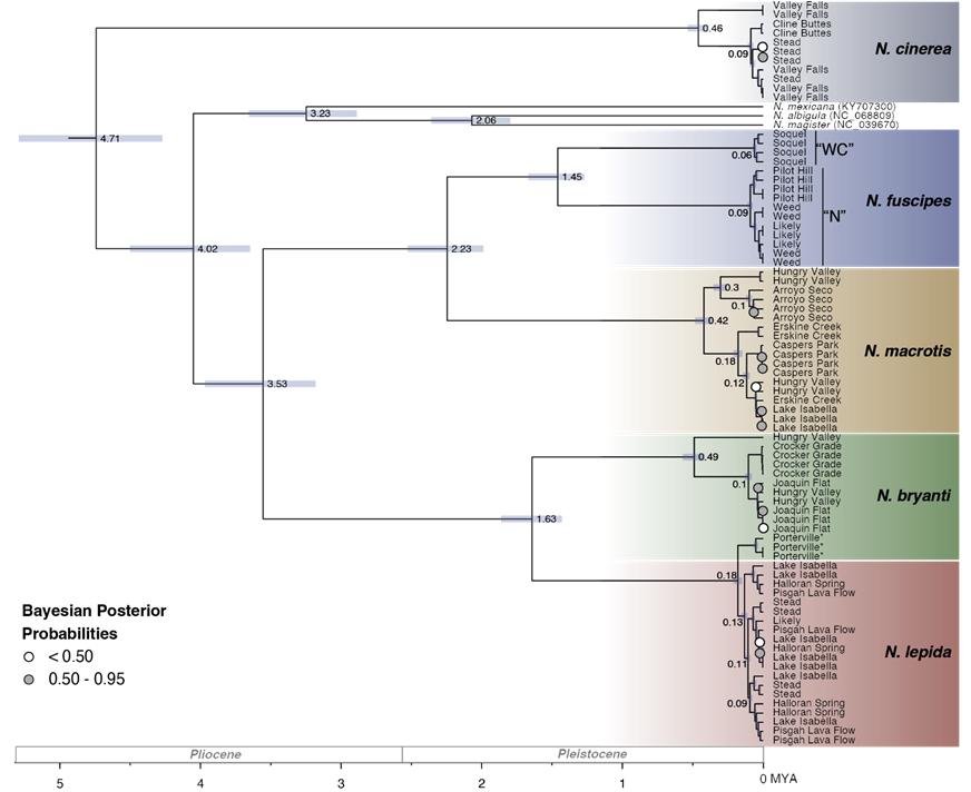 Figure 3 A time-calibrated Bayesian phylogeny estimated using whole mitochondrial genome data in BEAST2. All nodes are supported with > 0.95 Bayesian Posterior Probability except for those shown in white and gray according to the legend. To better visualize focal ingroup taxa divergences, outgroups have been removed but the entire tree is shown in full in Supplemental Figure 1. Nodes are labeled with median ages (in millions of years), with the light blue bars denoting 95 % confidence intervals. Tips from our five focal species are labeled according to collection locality. Additional taxa were included in the analysis and are identified with their GenBank accession numbers. Note that three individuals of N. bryanti from the Porterville locality (indicted by *) fall out within the N. lepida clade. Two clades within N. fuscipes (West-Central, “WC”, and North, “N”) are labeled and discussed in the text.