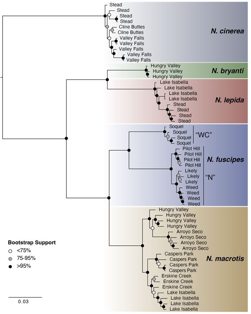 Figure 4 Maximum-likelihood phylogeny estimated using nuclear SNP data. Nodes with low (<75 %), medium (75 to 95 %), or high (>95 %) bootstrap support are indicated using white, gray, or black circles, respectively. Branch lengths are scaled to substitutions per site. Tips are labeled according to collection locality. The topology we present is mid-point rooted on the longest branch. Two clades within N. fuscipes (West-Central, “WC”, and North, “N”) are also labeled and discussed in the text.