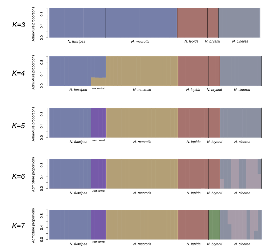 Admixture and introgression. The NGSAdmix analysis showed that the nuclear dataset was most consistent with K = 5 and K = 7, but we show K = 3 to 7 because we find the progression of subdivision informative (Figure 5). At K = 3 we find the expected distinction of N. cinerea from an N. fuscipes-N. macrotis group and an N. lepida-N. bryanti group. At K = 4, N. fuscipes and N. macrotis become distinct, and interestingly, the Soquel population (representing west central N. fuscipes) appears to be admixed between N. fuscipes and N. macrotis. At K = 5, we see the distinction of the Soquel population of N. fuscipes (the most supported solution), at K = 6 we see a poorly supported solution with subdivision within N. cinerea, and at K = 7 we see the distinction of N. bryanti from N. lepida (the second most supported solution).