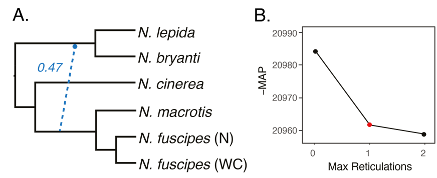 Using PhyloNet, we tested whether a phylogenetic network (allowing for reticulation) offered a better fit to our data compared to a traditional bifurcating tree. We tested models with a maximum of 0, 1, or 2 reticulations (MR = 0 to 2) and found a significant improvement in model MAP scores at MR = 1 (Posterior ESS = 174; Figure 6). The network topology suggests a sister relationship between N. cinerea and the N. macrotis-N. fuscipes clade, but with ancestral introgression between the ancestors of N. macrotis-N. fuscipes and the ancestors of N. lepida-N. bryanti (inheritance probability γ = 0.47).