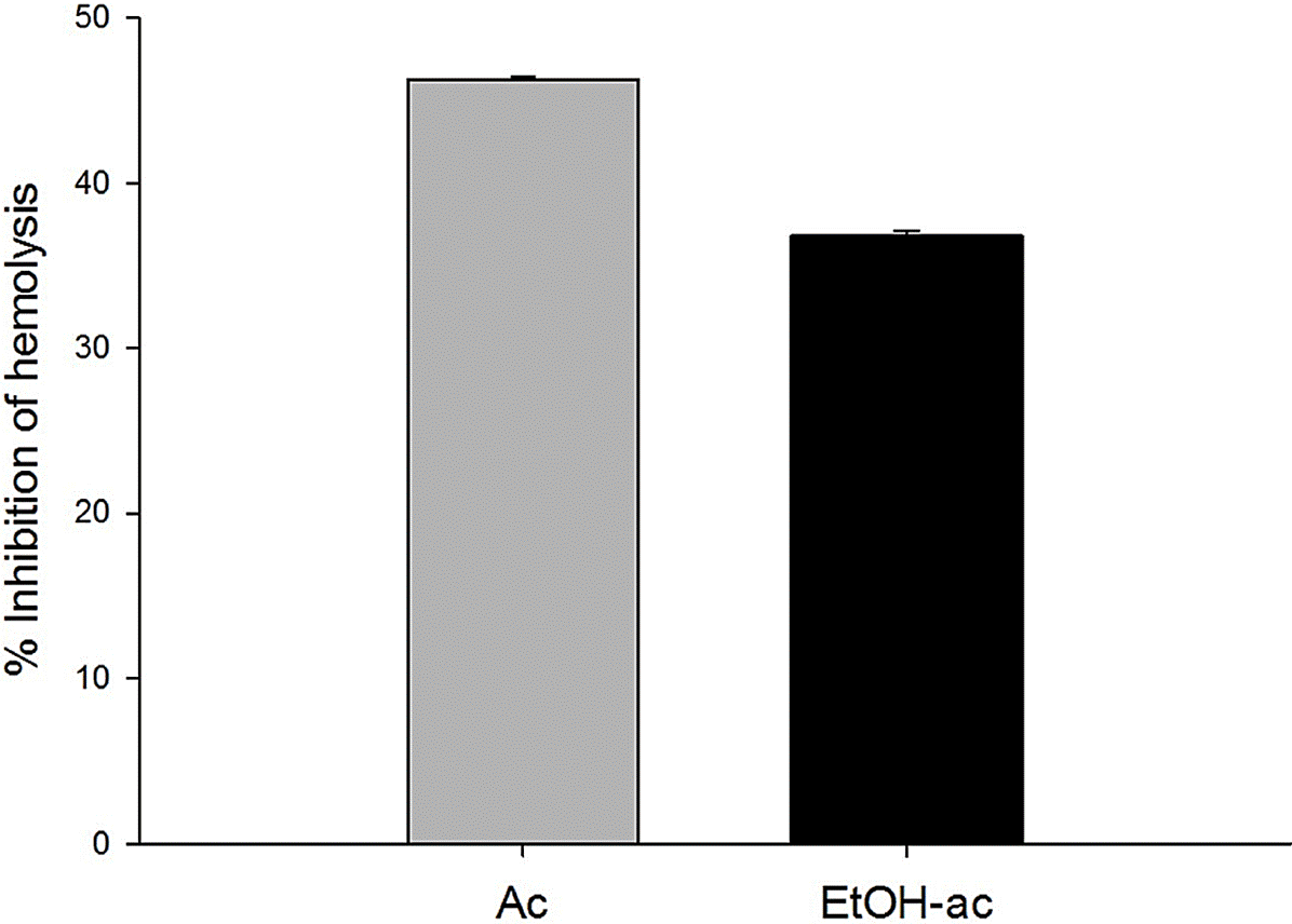 Figure 3 shows the protective capacity of Ac and EtOH-ac extracts on human red blood cells, using AAPH radical. The graph indicates that the values for the percentage of inhibition of hemolysis were 46.3 % and 36.8 % for Ac and EtOh-ac extracts, respectively.