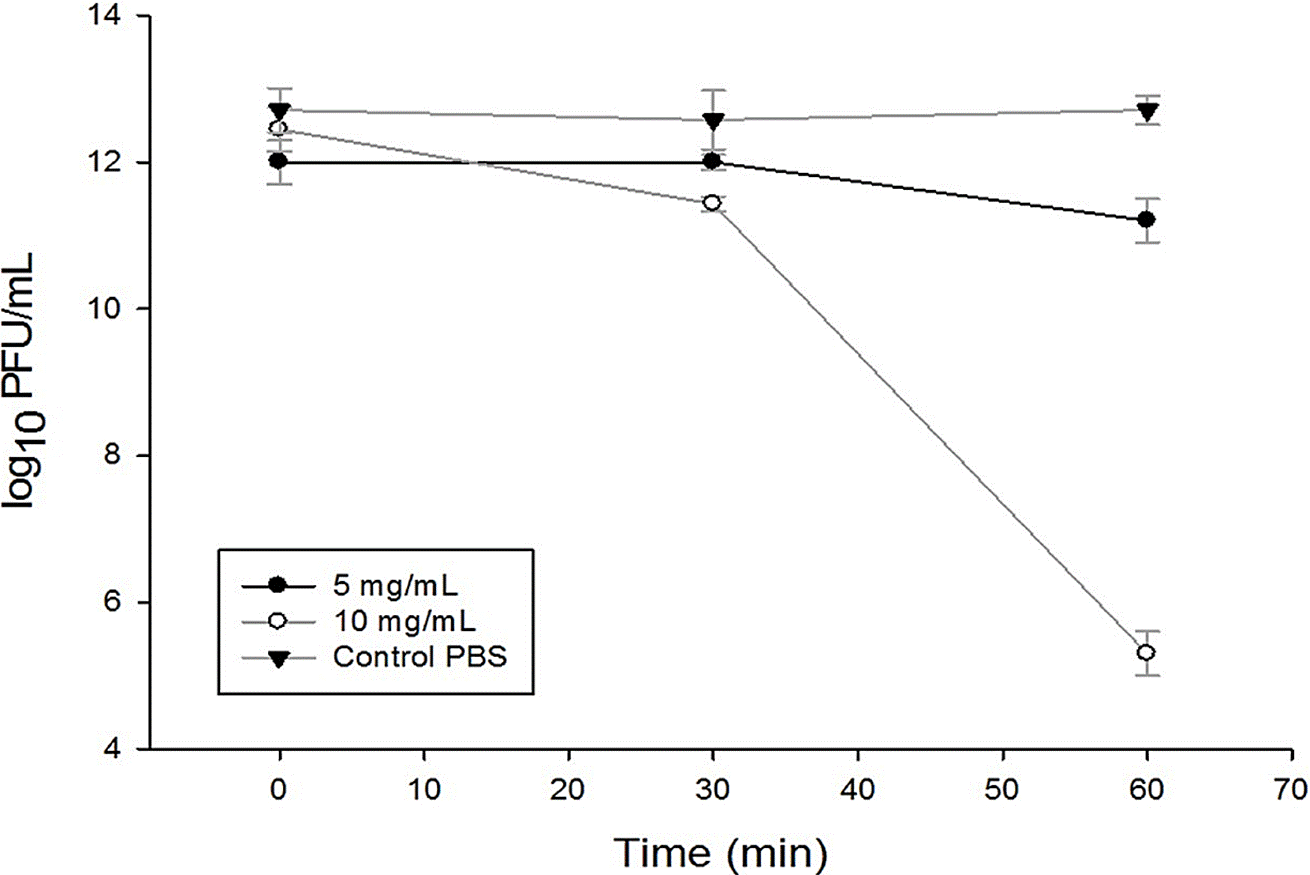 For Ac extract in both concentrations of 5 and 10 mg/mL, during the first 30 minutes, no significant reductions were observed, achieving values of reduction of the order of 0.70 Log10 PFU/mL, and it was only until 60 minutes of contact that the concentration of virus decreased 1.50 logarithms at the concentration of 5 mg/mL. Nonetheless, the highest shown reduction was at the concentration of 10 mg/mL, decreasing up to 2 logarithms, possibly due to the depletion and reduction of the bioavailability of the active metabolites or compounds after 30 min of contact time with the extracts.