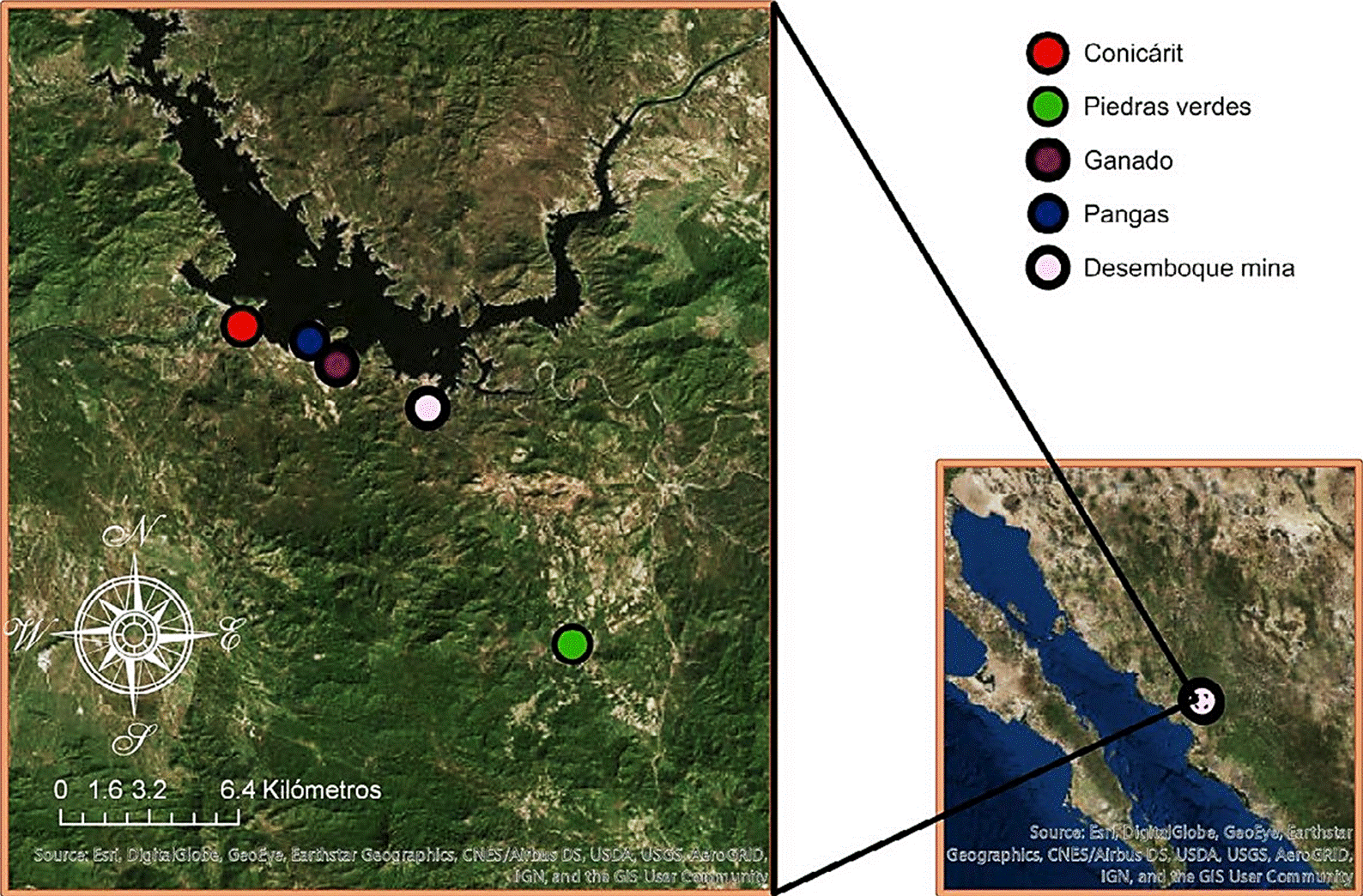 En este estudio se llevó a cabo un monitoreo durante 9 meses (los cuales incluyen temporada de lluvias y secas) con una frecuencia bimestral de As, Cu, Hg, Pb en agua superficial, agua de grifo, sedimento y pescado en la Presa Adolfo Ruiz Cortines desde mayo de 2017 hasta marzo de 2018. Todas las muestras fueron colectadas en 5 puntos estratégicos: el agua de grifo se recogió en las comunidades de Conicárit y Piedras Verdes y las muestras de agua superficial y de sedimentos costeros se tomaron del sitio de desemboque de escorrentías de la mina, del muelle de pangas de pescadores y del área de cría de ganado (Figura 1).