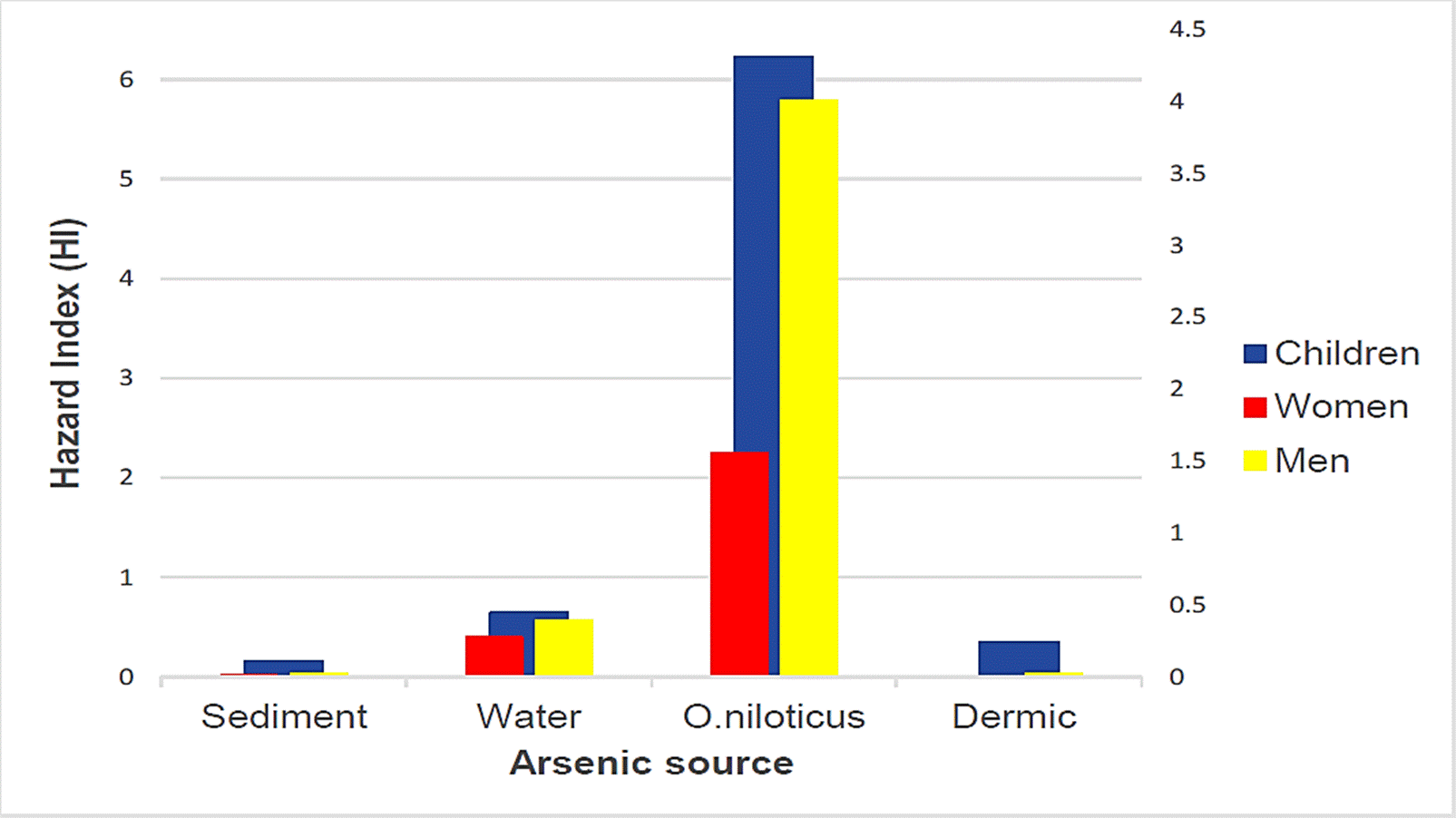 En una evaluación de riesgos anteriormente llevada a cabo en el sur de Sonora por Meza-Montenegro et al., (2012), se probó que existe una alta probabilidad de que la exposición de suelo agrícola contaminado con As y Pb produzca efectos adversos a la salud, éste resultado respalda los resultados en esta investigación en donde se encontró un potencial efecto a la salud por el consumo de agua de grifo y O. niloticus contaminados con As y Pb además en ambos estudios se calculó que los niños son los que tienen mayor índice de riesgo. Hay que recalcar que otros estudios reportan hallazgos similares: Monroy et al. (2002) informaron que, en muestras sanguíneas de niños de San Luis Potosí, México, los metales pesados están biodisponibles; por otro lado, en evaluaciones de riesgos similares a este estudio han reportado que es mayor el riesgo a la salud por metales pesados en niños que en adultos (Giri & Singh, 2015; Liu et al., 2018).