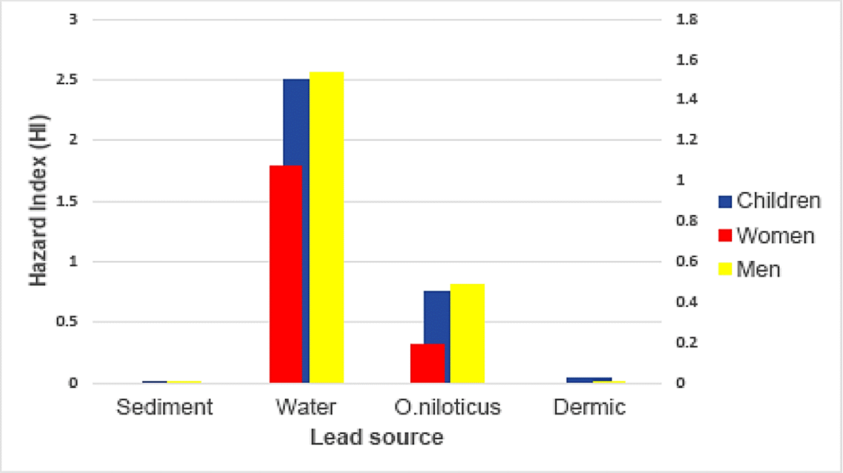 A pesar que el HI en niños es el mayor entre las poblaciones evaluadas, éste índice puede estar subestimado debido a que según estudios recientes de la Organización Mundial de la Salud (2017), la exposición aguda a plomo es más notable en niños, porque su cerebro y sistema nervioso puede absorber de 4 a 5 veces más Pb que los adultos. En investigación se reporta un riesgo a la salud mayor en hombres que en mujeres, esto se debe a que por cuestiones ocupacionales y de consumo, los varones de estas comunidades específicamente están más expuestos a las fuentes de metales pesados. No obstante, las mujeres son fisiológicamente más vulnerables que los hombres debido a que naturalmente acumulan mayor cantidad de grasa corporal, lo que aumenta la bioacumulación (Karastergiou et al., 2012; Park & Lee, 2013).