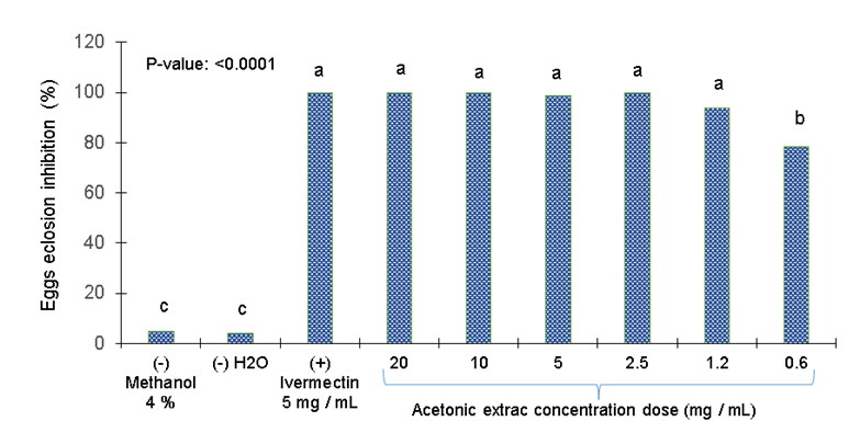 Figure 2 Eggs eclosion inhibition of H. contortus exposed to ethanolic extract elaborated with C. coriaria fruits (abc different literals eclosion inhibition differed between treatments)