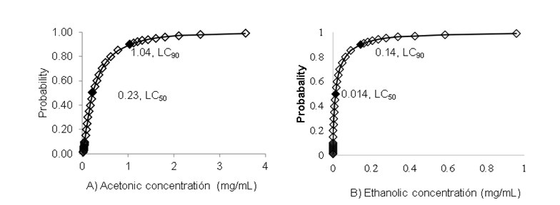 The data were analyzed under a completely randomized design, with the following statistical model: Y ij = μ + T i + ξ ij ; where: Y ij = eclosion inhibition; μ = general mean; T i = effect of the extracts and controls ξ i = the random error of the treatment. The difference between means was compared with the Tukey test (p < 0.05). In addition, minimum (LC50) and maximum (LC90) lethal concentrations were determined using the PROBIT procedure of the SAS statistical package (SAS, 2002).