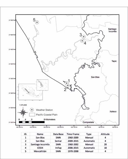 The climatic data used came from the weather stations available at three institutions. The oldest data series were obtained from the National Meteorological Service (SMN) available through the Climate Computing Project (CLICOM) climatological database. The most recent data series (2010 onwards) were obtained from the National Institute of Agricultural and Livestock Forestry Research (INIFAP) and the Secretariat of the Navy (SEMAR) (Figure 1). We corroborated that each station had at least 80 % consistent data as suggested by other research (Vázquez, 2010; Lobato-Sánchez & Altamirano-del-Carmen, 2017). In order to analyze the variability of at least the last 30 years as recommended by the WMO (Trewin, 2007), the oldest stations (San Blas and Santiago Ixcuintla of the SMN) were joined with the most recent ones (San Blas of SEMAR and CESIX of INIFAP), the homogeneity of their descriptors was corroborated (Nájera et al., 2020). For the case of the Mexcaltitán weather station (SMN), the data series was completed with data estimated by Harris et al. (2014) available in the WorldClim 2.1 database (https://www.worldclim.org) (Fick & Hijmans, 2017). This database was also used to complete the missing data in the rest of the series.