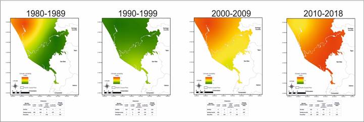 Regarding the climatic anomalies dimension, the most variable periods were 1980-1989 in the Mexcaltitán area, 2000-2009 in Santiago Ixcuintla and 2010-2018 in the San Blas area. The highest temperature anomalies were in the decrease of minimum temperature; anomalies higher than 4 % and 5 % in San Blas and Santiago Ixcuinlata, and 7 % in Mexcaltitán. In the most variable period, the highest precipitation anomalies were in the average decrease in precipitation; San Blas 10.8%, Santiago Ixcuintla 7.8 %, and Mexcaltitán 7.6 %.