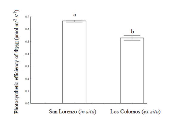 Figure 1 Average (± SE) of the effective photosynthetic efficiency of photosystem II ΦPSII (µmol m-2 s-1) in Magnolia pugana seedlings transplanted in two sites: San Lorenzo (in situ) and Bosque Los Colomos (ex situ).