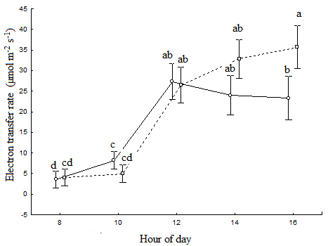 In electron transfer rate (ETR) we also found significant differences (F = 17.62, p ˂ 0.01) by site effect. Seedlings from the SL site showed 82.4 % more ETR (20.8a ± 2.6) in contrast to those from the BLC site (17.3b ± 1.9). There were also differences by sampling time (F = 92.54, p ˂ 0.0001). Between 12:00 and 16:00 hours, the highest electron transfer rate was recorded. We found differences by site × sampling time interaction (F = 16.47, p ˂ 0.001), ETR increased in the hours with the highest solar radiation from 12:00 hours and up to 16:00 hours, but at the BLC site seedlings decreased ETR in the last two sampling hours, in contrast to those in SL (Fig. 2).