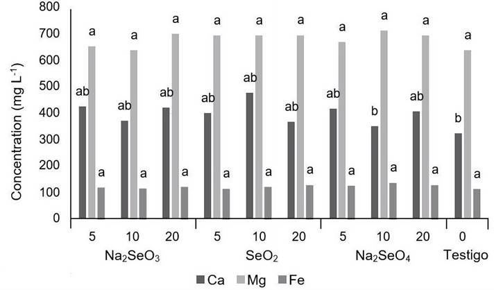These results are similar to those reported by Sabatino et al. (2019), who showed that the application of Na2SeO4 at doses of 0.2 to 1.5 mg L-1 registered a negative correlation with the Ca concentration in Endibia rizada L. In contrast, this response behavior is contrary to that reported by Golubkina et al. (2019), who noted that the supply of Na2SeO4 at doses of 50 mg L-1 increased Ca concentration in Allium ascalonicum L. These opposing effects on Ca, suggest that it may be related to the doses used since it has been recognized that the application of Se at moderate doses can be beneficial in plants, but at high doses can produce an opposite effect given to oxidative processes (Palacios-Márquez et al., 2021); the type of effect may also be related to the plant species in which this microelement is applied and the chemical form in which it is supplied (Ziogas et al., 2020; Li et al., 2018).