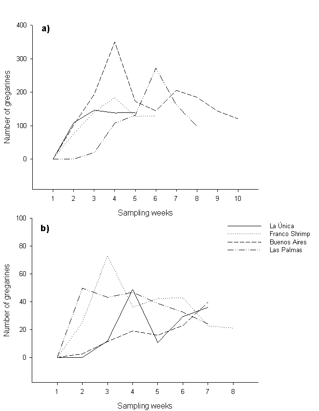 Table 2 Prevalence of gregarines and severity degrees in the white leg shrimp from four farms in San Blas, Nayarit.
