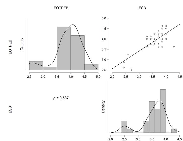The correlation between the two variables was then analyzed. Figure 1 shows the correlation points and distribution parameters of the variables related to the self-perception of pro-environmental behavior and the expectation of teachers’ pro-environmental behavior. In Figure 1, the points obtained in the scatter diagram reflect the existence of a moderate, positive, and significant association between the perceived pro-environmental behaviors of the college teacher and the pro-student environmental self-behaviors (p <.001, rs= 0.54). That is higher perceived expectations of the teacher's pro-environmental performance positively influence students' self-evaluation of their overall environmental self-behavior. Thus, the importance of actively modeled social influences can be evidenced (Vanegas, et al., 2018) through the teaching of a course with environmental contents, which is congruent with the notion that the pro-environmental acting of others can be a guide to directly channel pro-environmental self-behaviors (Corral-Verdugo, 2001). The findings highlight social expectations as social norms that can be predictors of pro-environmental behaviors (Carrus, et al., 2010).