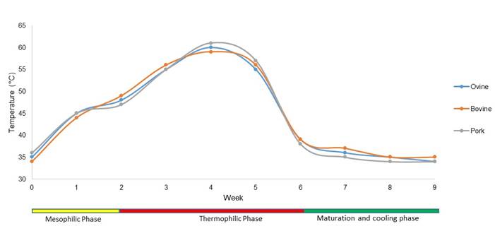 The bokashi temperature, regardless of manure source, raised from 35° to 60° C in the first three weeks (mesophilic phase), from week three to week five, the average temperature remained at 60° C, and gradually decreased to 38° C (thermophilic phase) at the end of week six, and then maintained at room temperature (30 to 35° C) until day 60 (cooling and maturation phase) (Figure 1). The temperatures recorded suggest that the fermentation was correct, the first days favor the growth of mesophilic organisms, which degrade carbohydrates of the organic matter (Sanchez et al., 2017), during this fermentative phase, exothermic processes cause gradually increasing the temperature, thus promoting the growth of thermophilic microorganisms, initiating the thermophilic phase, degrading by enzymatic action compounds of complex structure such as proteins and eliminates pathogenic microorganisms (Neklyudov et al., 2008), as the amount of fermentable organic matter in the bokashi decreases, the temperature decreases, reducing the amount of thermophiles and increasing again the mesophilic population until the remaining fermentable carbohydrates are exhausted (Zeng et al., 2010) and the cooling and maturation phase begins; in this phase, the less degradable compounds are decomposed and the precursors of humic substances emerge (Vélez-Sánchez-Verín et al., 2008), resulting in a good quality bokashi.