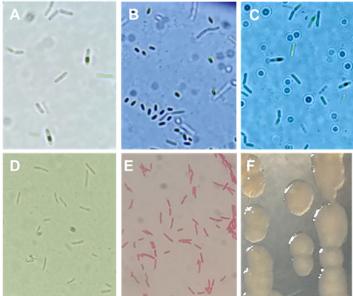Figure 1 Morphological characteristics of Bacillus subtilis and Pseudomonas donghuensis. A, B and C) vegetative cells and endospore production of B. subtilis (A- B15, B- BITV and C- BIBT). D) P. donghuensis vegetative cells, B) Gram stain. C) Bacterial colony in AN culture medium.