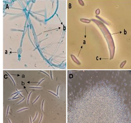 Figure 2 Microscopic observation of Fusarium oxysporum. A) a- Chlamydospore globosa and b- Phialides, B) a- Microconidia, b- Macroconidia with three septa and c- foot cell. C) a- Macroconidia with four septa and b- with three septa. D) Sporodochium.
