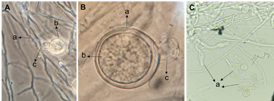 The identification and report of the oomycete corresponded to Pythium aphanidermatum, such work was published before the present research and was reported as an aggressive and fast-growing strain that causes “Damping off” (Jiménez-Pérez et al., 2022). The hyphae were ascertained to be coenocytic toruloid (Figure 3Aa), smooth spherical terminal oogonia (Figure 3Aa, Ba), aplerotic oospores (Figure 3Bb), diclinous or monoclinous antheridia (Figure 3Ac, Bc), and filamentous and irregular sporangia (Figure 3Ca), as shown in Figure 3 (Van der Plaats-Niterink, 1981; Watanabe, 2010; Jiménez-Pérez et al., 2022).