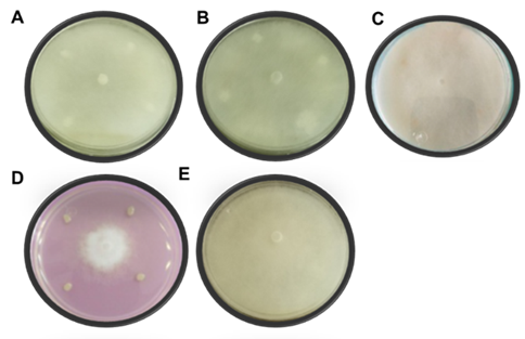 Figure 5 In vitro antagonism of the different strains of Bacillus spp., against F. oxysporum at six days of confrontation in comparison with the control. A) BIBT, B) B15, C) BITV, D) Pd, and E) Control.