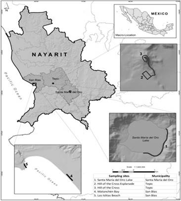 Figure 1 . Map of the State of Nayarit, Mexico. Geographical location of sampling sites.