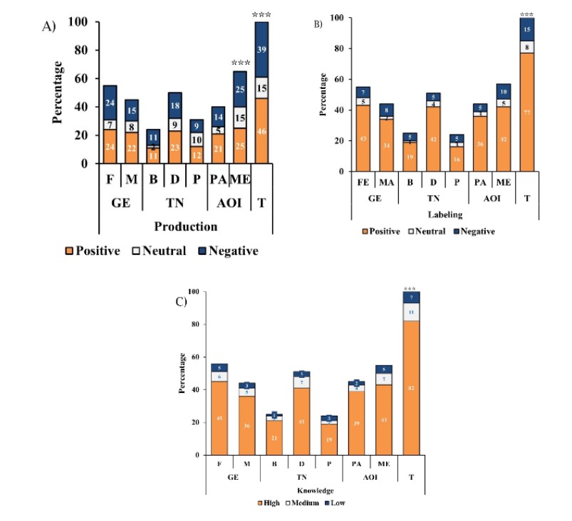 Figure 3 . Perception of the students about animal welfare as an attribute to incorporate into the meat during the process of A) production, B) labeling, and C) knowledge. Based on the GE (gender, F: Female and M: Male); TN (training core, B: Basic, Disciplinary, and P: professionalizing) and AOI (area of occupational interest, AP: Production and AM: Medicine. T: total population). *** p < 0.001.