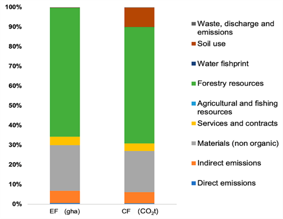 For both footprints (EF and CF) the highest consumption is in the category of forest resources, followed by non-organic materials, and then for CF, it would be land use, while for EF it would be indirect emissions (Figure 2).