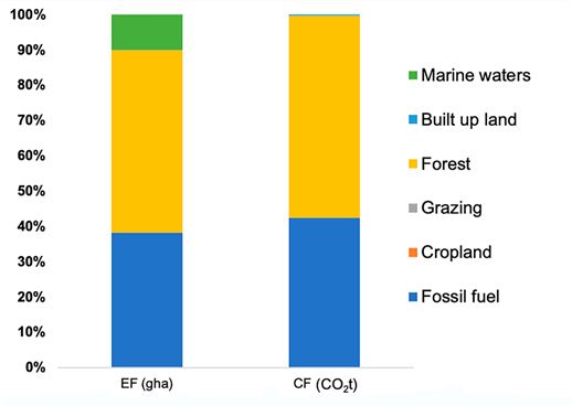 The impact of the footprints (EF and CF) on the ecosystem are very similar, both have a greater impact on forests, followed by forests for CO2, and CF has a third impact on the marine ecosystem (Figure 2).