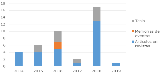 La gráfica 1 muestra el resultado de la búsqueda de literatura realizada en este artículo, de 2014 a abril de 2019. Los años 2017 y 2018 se destacan como los de menor y mayor cantidad de trabajos publicados, respectivamente; las investigaciones publicadas en 2018 representan el 43.5% del total de los trabajos identificados. Las revistas científicas se identificaron como los medios de publicación más utilizados (70%), seguidas de las tesis (25%).