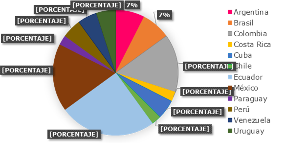 La gráfica 2 muestra los países de origen de las investigaciones consultadas. Como se puede observar, Ecuador es el país con mayor cantidad de publicaciones durante el período analizado (25%), seguido por México (18%) y Colombia (15%). Respecto a la distribución de las publicaciones por regiones del continente latinoamericano, América del Sur es la zona geográfica que domina este aspecto, con el 74% de las investigaciones.