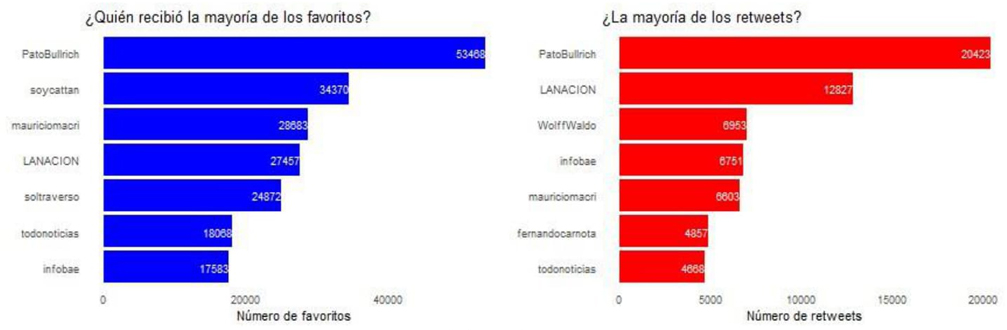 Por otra parte, Calvo (2015) advierte que la circulación de mensajes mayormente difundidos no responde al tipo de contenido, sino que se relaciona con su origen político y a la red de relaciones sociales a la que pertenece. En la gráfica 2 se muestran aquellos usuarios cuyas publicaciones recibieron la mayor cantidad de favoritos y de retuits.