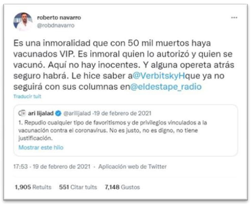 En el caso analizado por Pérez Lagos y Cabral Salles (2018), los autores encuentran en Twitter un espacio democrático de circulación de la palabra ciudadana; y en el presente caso se advierte cómo #VacunatorioVip se transforma en un acto opositor, en donde resuena entre los mismos adeptos y seguidores (Calvo, 2015). No obstante, resulta sugerente observar aquellos perfiles cercanos o partidarios al gobierno actual también repudiando lo sucedido, y ajustándose a la imagen del ministro de salud.