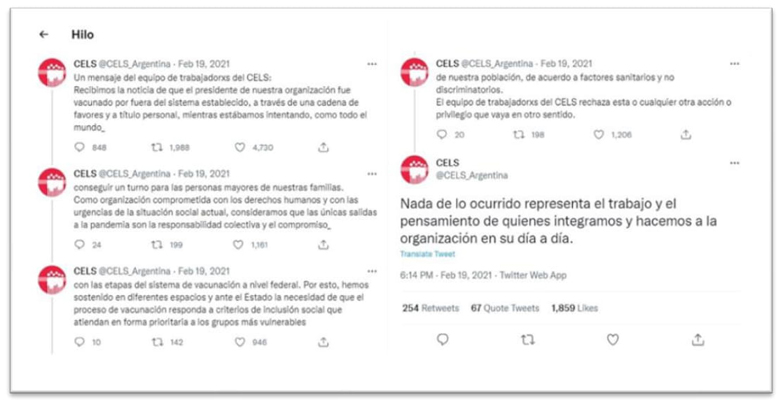 Minutos después, el Centro de Estudios Legales y Sociales (CELS), presidido por Verbitsky en ese momento, también repudió los hechos mediante su cuenta (ver figura 3).