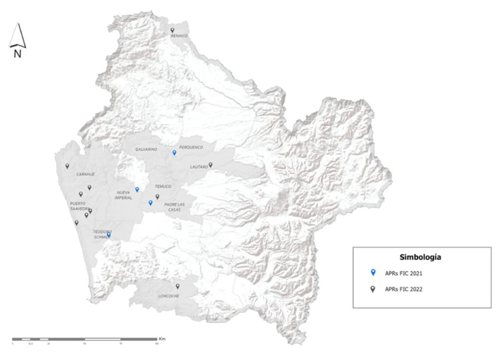 Los APR entrevistados se ubican en los siguientes territorios: Botrolhue, en la comuna de Temuco; Central Alhueco, en la comuna de Lautaro; Muquén, en la comuna de Loncoche; Tijeral, en la comuna de Renaico; Puaucho, Peleco tres esquinas, Alma Cudilefu y Quechahui, en la comuna de Saavedra; Locoyamo y Chapo II, en la comuna de Carahue. La ubicación de los comités APR mencionados se muestra en la imagen 1.