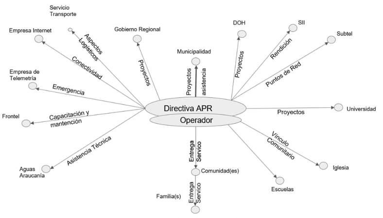Las entidades responsables de la captura, la distribución y la gestión de la calidad del agua potable en los sectores rurales en Chile reciben el nombre de cooperativas o comités de agua potable rural (en adelante, comités APR), cuyo origen se remonta a la década de 1960. Su organización está a cargo de una directiva que trabaja de manera voluntaria, la cual tiene la responsabilidad de gestionar la parte financiera y contable, así como de mantener relaciones con la comunidad a la que sirve. Además, se encarga de la gestión operativa del servicio, para lo cual cuenta con trabajadores conocidos como operarios. Si bien inicialmente el financiamiento de los comités APR en Chile provino del Banco Interamericano de Desarrollo (BID), actualmente cuentan con apoyo económico por parte de los gobiernos regionales y del Ministerio de Obras Públicas (en adelante, MOP) de Chile, así como de las propias contribuciones de los usuarios del servicio (Nicolás-Artero, 2016).