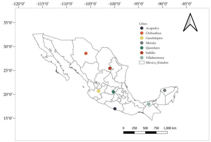 La selección de las ciudades fue hecha con el objetivo de comparar los resultados con estudios previos por el índice de movilidad urbana, según los datos publicados por el Instituto de Investigación en Política Pública (IMCO, 2019), abarcando ciudades con movilidad alta, media y baja. Las ciudades estudiadas en esta investigación fueron: Acapulco, Chihuahua, Guadalajara, Mérida, Querétaro, Saltillo y Villahermosa; todas ellas localizadas en el territorio mexicano. El área de estudio se muestra en la Figura 1.