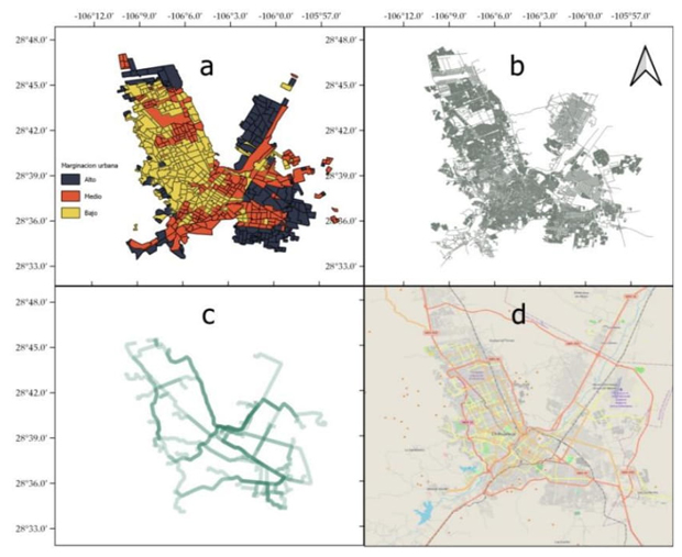 Fuentes: a) elaboración propia; b) elaboración propia con datos del IMPLAN Chihuahua; c) elaboración propia; d) Open Street Map.