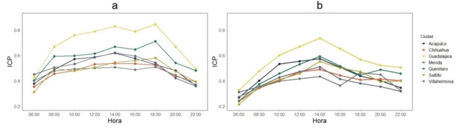 Las tendencias temporales del índice de congestión promedio por ciudad se muestran en la Figura 3, tanto para días de entre semana como para fines de semana. La Figura 3 muestra patrones de tráfico diferentes para ciudades, horarios y días de la semana. En la Figura 3a se muestra que entre semana los picos más altos de tráfico se observan a las 14:00 y a las 18:00 hrs., mientras que el fin de semana el pico de tráfico se encuentra muy marcado a las 14:00 hrs. Las ciudades que mostraron el más alto índice de tráfico fueron Guadalajara y Querétaro.