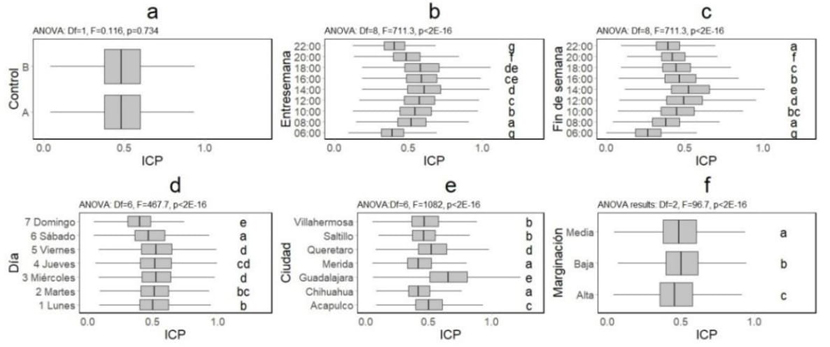 Los grupos horarios de entre semana (4b), fin de semana (4c), por día (4d), por ciudad (4e) y por grupos de marginación (4f) mostraron diferencias significativas (p<0.05) y agrupaciones de Tukey con una amplia diversidad, por lo cual la metodología puede diferenciar la congestión de tráfico temporal y espacialmente (p<0.05).