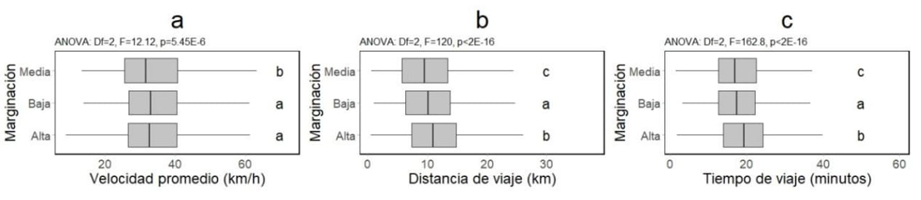 En el comparativo entre las variables de velocidad promedio, distancia de viaje y tiempo de viaje se consideran los grupos de marginación urbana, también se encontraron diferencias significativas (p<0.05) como se muestra en la Figura 5.