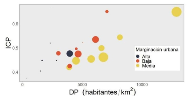 Todos los datos demográficos, económicos y de congestión de tráfico fueron organizados por ciudad y por grupo de marginación urbana en la Tabla 1. En la Figura 6 aparecen las interacciones entre los diferentes grupos de marginación (diferentes colores), el porcentaje de población del grupo con respecto de la población de la ciudad (diámetro del marcador) y la posición de (x, y) respecto de la densidad poblacional y su índice de congestión.
