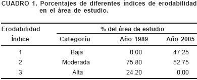 El Cuadro 1 muestra que para 1989 algo más de las dos terceras partes de los suelos clasificaban como moderadamente erodibles y menos de un tercio como altamente erodibles. Para 2005 no clasifican áreas de erodabilidad alta y aparece cerca del 50 % con erodabilidad baja. Este comportamiento se puede explicar por la modificación de algunas de las propiedades evaluadas con tendencia a la pérdida de profundidad y cambios en la composición mecánica del suelo.